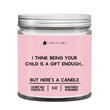 Elevate your moments of gratitude with the exquisite "I Think Being Your Child Is A Gift Enough" candle. This luxurious creation encapsulates the essence of appreciation through its enchanting scent. Infused with the sweet and floral notes of mimosa, this candle emanates a delightful aroma that resonates with warmth and love. Crafted with premium coconut wax and featuring a lead-free cotton wick, it guarantees a clean burn and a lingering fragrance that transforms any space into a haven of elegance and serenity. Perfect for celebrating the incredible parents in your life or indulging in a soothing self-care ritual, this candle is quintessential for Mother's Day, Father's Day, or any occasion where expressing gratitude is paramount.