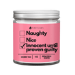 "Naughty, Nice, Innocent Until Proven Guilty" isn't just a candle; it's a comical and memorable Christmas gift that's bound to spark laughter. Whether adorning your holiday table or given as a unique present, this candle captures the essence of holiday cheer and mischief. Light up your seasonal celebrations with a dash of wit and the inviting scent of brown sugar, making it a perfect choice for spreading smiles and joy to friends, family, or anyone with a penchant for holiday humor.